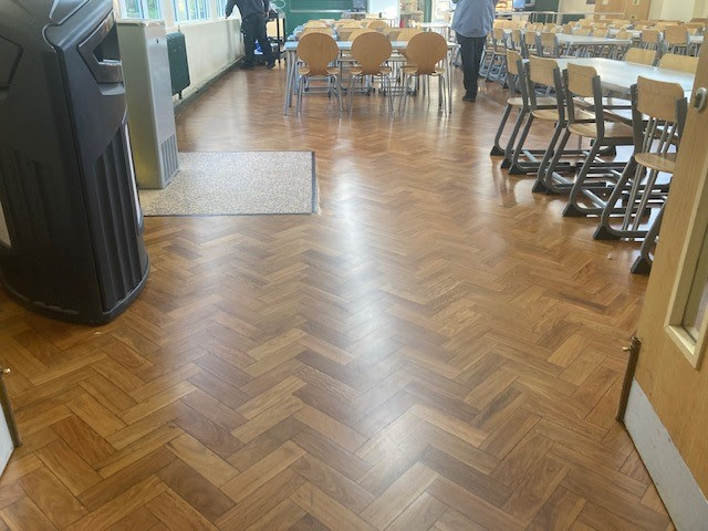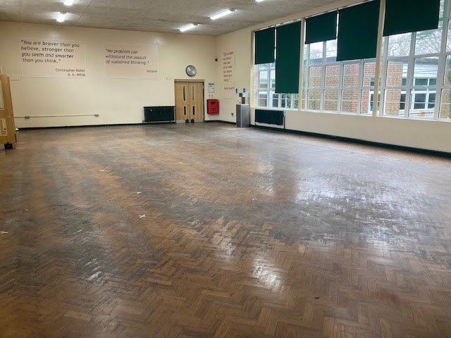 The school requested an assessment of their dining hall floor, which consisted of a worn-out tropical hardwood parquet. It appeared that the floor had never been restored in the school’s memory.